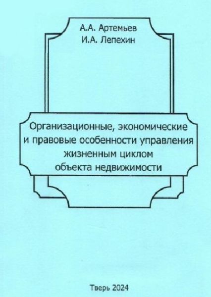 Артемьев, А. А. Организационные, экономические и правовые особенности управления жизненным циклом объекта недвижимости : монография / А. А. Артемьев, И. А. Лепехин. — Тверь : Тверской государственный технический университет, 2024. — 184 c. — ISBN 978-5-7995-1376-4. — Текст : электронный // Цифровой образовательный ресурс IPR SMART : [сайт]. — URL: https://www.iprbookshop.ru/151176.html (дата обращения: 23.05.2025). — Режим доступа: для авторизир. пользователей