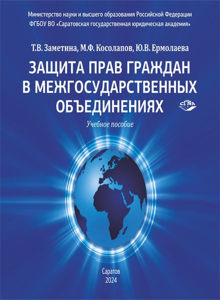 Заметина, Т. В. Защита прав граждан в межгосударственных объединениях : учебное пособие / Т. В. Заметина, М. Ф. Косолапов, Ю. В. Ермолаева. — Саратов : Издательство Саратовской государственной юридической академии, 2024. — 230 c. — ISBN 978-5-7924-2103-5. — Текст : электронный // Цифровой образовательный ресурс IPR SMART : [сайт]. — URL: https://www.iprbookshop.ru/151650.html (дата обращения: 09.06.2025). — Режим доступа: для авторизир. пользователей