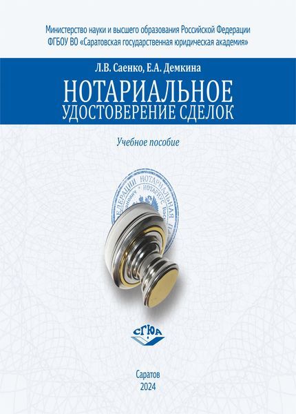 Саенко, Л. В. Нотариальное удостоверение сделок : учебное пособие / Л. В. Саенко, Е. А. Демкина. — Саратов : Издательство Саратовской государственной юридической академии, 2024. — 141 c. — ISBN 978-5-7924-2045-8. — Текст : электронный // Цифровой образовательный ресурс IPR SMART : [сайт]. — URL: https://www.iprbookshop.ru/151667.html (дата обращения: 09.06.2025). — Режим доступа: для авторизир. пользователей