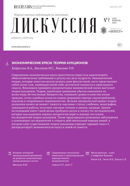 «Дискуссия» – это журнал для ученых и практиков, для аспирантов и докторантов, для докторов наук и студентов – всех, кто стремится к преодолению «дисциплинарных границ» между науками и к решению проблем социальной жизни. Экономический журнал научных публикаций «Дискуссия» включен в Перечень журналов ВАК (Перечень ведущих рецензируемых научных журналов и изданий, в которых должны быть опубликованы основные научные результаты диссертаций на соискание ученых степеней доктора и кандидата наук) по специальностям: 5.2.1. Экономическая теория (экономические науки), 5.2.2. Математические, статистические и инструментальные методы в экономике (экономические науки), 5.2.3. Региональная и отраслевая экономика (экономические науки), 5.2.4. Финансы (экономические науки), 5.2.5. Мировая экономика (экономические науки), 5.2.6. Менеджмент (экономические науки), а также в систему Российского индекса научного цитирования.