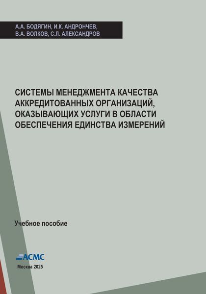 Системы менеджмента качества аккредитованных организаций, оказывающих услуги в области обеспечения единства измерений : учебное пособие / А. А. Бодягин, И. К. Андрончев, В. А. Волков, С. Л. Александров. — Москва : Академия стандартизации, метрологии и сертификации, 2025. — 147 c. — ISBN 978-5-93088-241-4. — Текст : электронный // Цифровой образовательный ресурс IPR SMART : [сайт]. — URL: https://www.iprbookshop.ru/152465.html (дата обращения: 09.07.2025). — Режим доступа: для авторизир. пользователей