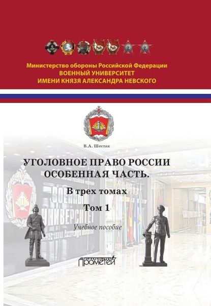 Шестак, В. А. Уголовное право России. Особенная часть. В 3 томах. Т.1 : учебное пособие / В. А. Шестак. — Москва : Прометей, 2025. — 1102 c. — ISBN 978-5-00172-517-6. — Текст : электронный // Цифровой образовательный ресурс IPR SMART : [сайт]. — URL: https://www.iprbookshop.ru/153454.html (дата обращения: 26.08.2025). — Режим доступа: для авторизир. пользователей