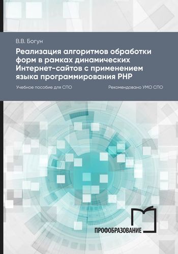 Богун, В. В. Реализация алгоритмов обработки форм в рамках динамических Интернет-сайтов с применением языка программирования РНР : учебное пособие для СПО / В. В. Богун. — 2-е изд. — Саратов, Москва : Профобразование, Ай Пи Ар Медиа, 2026. — 169 c. — ISBN 978-5-4488-0897-5, 978-5-4497-0733-8. — Текст : электронный // Цифровой образовательный ресурс IPR SMART : [сайт]. — URL: https://www.iprbookshop.ru/153622.html (дата обращения: 04.09.2025). — Режим доступа: для авторизир. пользователей