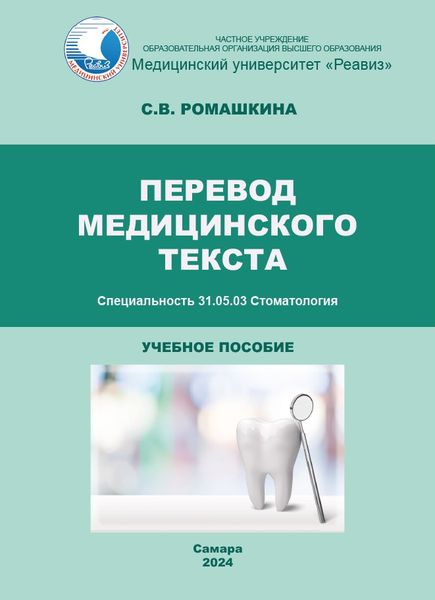 Ромашкина, С. В. Перевод медицинского текста : учебное пособие для подготовки к практическим занятиям по дисциплине «Иностранный язык». 31.05.03 Стоматология / С. В. Ромашкина. — Самара : РЕАВИЗ, 2024. — 160 c. — Текст : электронный // Цифровой образовательный ресурс IPR SMART : [сайт]. — URL: https://www.iprbookshop.ru/153807.html (дата обращения: 04.09.2025). — Режим доступа: для авторизир. пользователей