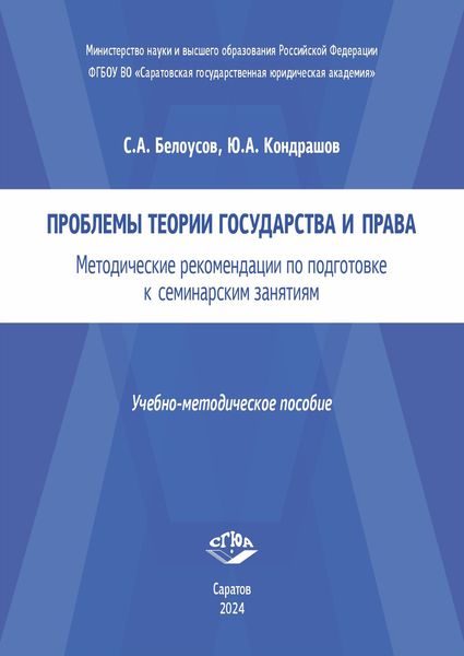Белоусов, С. А. Проблемы теории государства и права: методические рекомендации по подготовке к семинарским занятиям : учебно-методическое пособие / С. А. Белоусов, Ю. А. Кондрашов. — 2-е изд. — Саратов : Издательство Саратовской государственной юридической академии, 2024. — 79 c. — ISBN 978-5-7924-2112-7. — Текст : электронный // Цифровой образовательный ресурс IPR SMART : [сайт]. — URL: https://www.iprbookshop.ru/154026.html (дата обращения: 09.09.2025). — Режим доступа: для авторизир. пользователей