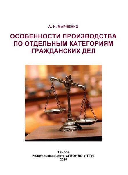 Марченко, А. Н. Особенности производства по отдельным категориям гражданских дел : учебное пособие / А. Н. Марченко. — Тамбов : Тамбовский государственный технический университет, ЭБС АСВ, 2025. — 81 c. — ISBN 978-5-8265-2921-8. — Текст : электронный // Цифровой образовательный ресурс IPR SMART : [сайт]. — URL: https://www.iprbookshop.ru/154953.html (дата обращения: 04.10.2025). — Режим доступа: для авторизир. пользователей