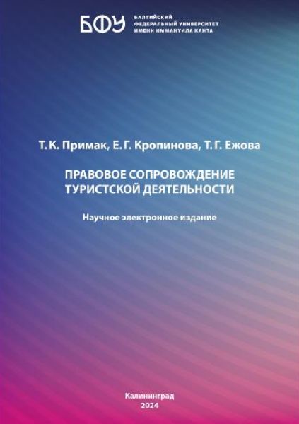 Примак, Т. К. Правовое сопровождение туристской деятельности : монография / Т. К. Примак, Е. Г. Кропинова, Т. Г. Ежова. — Калининград : Балтийский федеральный университет им. Иммануила Канта, 2024. — 128 c. — ISBN 978-5-9971-0897-7. — Текст : электронный // Цифровой образовательный ресурс IPR SMART : [сайт]. — URL: https://www.iprbookshop.ru/155212.html (дата обращения: 13.10.2025). — Режим доступа: для авторизир. пользователей
