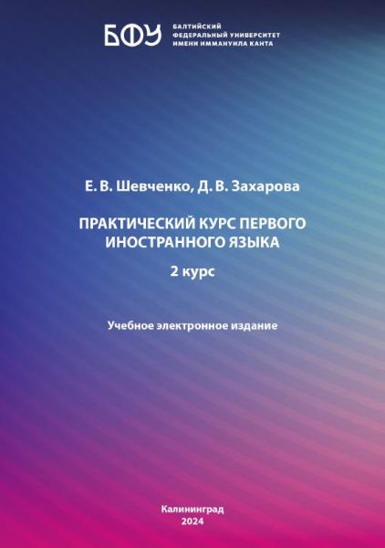 Шевченко, Е. В. Практический курс первого иностранного языка. 2 курс : учебное пособие / Е. В. Шевченко, Д. В. Захарова. — Калининград : Балтийский федеральный университет им. Иммануила Канта, 2024. — 84 c. — ISBN 978-5-9971-0905-9. — Текст : электронный // Цифровой образовательный ресурс IPR SMART : [сайт]. — URL: https://www.iprbookshop.ru/155217.html (дата обращения: 13.10.2025). — Режим доступа: для авторизир. пользователей