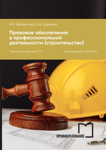 Белоусова, К. А. Правовое обеспечение в профессиональной деятельности (строительство) : учебное пособие для СПО / К. А. Белоусова, А. А. Коркина. — Саратов, Москва : Профобразование, Ай Пи Ар Медиа, 2026. — 84 c. — ISBN 978-5-4488-2890-4, 978-5-4497-5262-8. — Текст : электронный // Цифровой образовательный ресурс IPR SMART : [сайт]. — URL: https://www.iprbookshop.ru/158236.html (дата обращения: 16.02.2026). — Режим доступа: для авторизир. пользователей