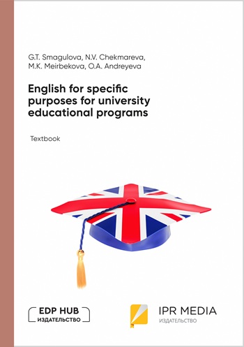 English for specific purposes for university educational programs : textbook / G. T. Smagulova, N. V. Chekmareva, M. K. Meirbekova, O. A. Andreyeva. — Алматы, Москва : EDP Hub (Идипи Хаб), Ай Пи Ар Медиа, 2026. — 229 c. — ISBN 978-5-4497-5234-5. — Текст : электронный // Цифровой образовательный ресурс IPR SMART : [сайт]. — URL: https://www.iprbookshop.ru/158261.html (дата обращения: 06.02.2026). — Режим доступа: для авторизир. пользователей