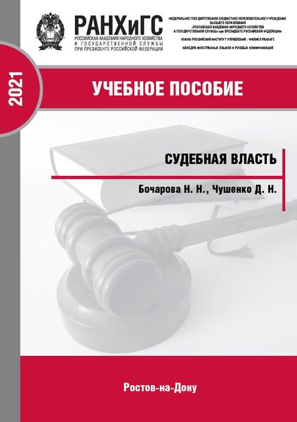 Бочарова, Н. Н. Судебная власть : учебное пособие / Н. Н. Бочарова, Д. Н. Чушенко. — Ростов-на-Дону : Южно-Российский институт управления – филиал РАНХиГС, 2021. — 276 c. — ISBN 978-5-6042500-0-6. — Текст : электронный // Цифровой образовательный ресурс IPR SMART : [сайт]. — URL: https://www.iprbookshop.ru/158388.html (дата обращения: 11.02.2026). — Режим доступа: для авторизир. пользователей