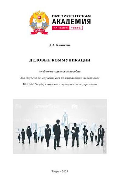 Клинкова, Д. А. Деловые коммуникации : учебно-методическое пособие для студентов очной, очно-заочной и заочной форм обучения, обучающихся по направлению подготовки бакалавриата 38.03.04 Государственное и муниципальное управление / Д. А. Клинкова. — Тверь, Курск : ЗАО «Университетская книга», 2024. — 131 c. — ISBN 978-5-907884-38-0. — Текст : электронный // Цифровой образовательный ресурс IPR SMART : [сайт]. — URL: https://www.iprbookshop.ru/158495.html (дата обращения: 16.02.2026). — Режим доступа: для авторизир. пользователей