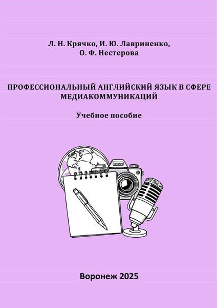 Крячко, Л. Н. Профессиональный английский язык в сфере медиакоммуникаций : учебное пособие / Л. Н. Крячко, И. Ю. Лавриненко, О. Ф. Нестерова. — Воронеж : Воронежский государственный технический университет, ЭБС АСВ, 2025. — 124 c. — ISBN 978-5-7731-1255-6. — Текст : электронный // Цифровой образовательный ресурс IPR SMART : [сайт]. — URL: https://www.iprbookshop.ru/158554.html (дата обращения: 13.02.2026). — Режим доступа: для авторизир. пользователей