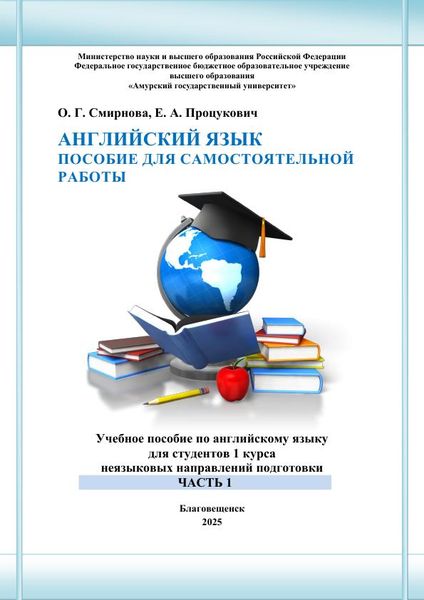 Смирнова, О. Г. Английский язык. Пособие для самостоятельной работы. В 2 частях. Ч. 1 : учебное пособие по английскому языку / О. Г. Смирнова, Е. А. Процукович. — Благовещенск : Амурский государственный университет, 2025. — 227 c. — Текст : электронный // Цифровой образовательный ресурс IPR SMART : [сайт]. — URL: https://www.iprbookshop.ru/159619.html (дата обращения: 19.03.2026). — Режим доступа: для авторизир. пользователей