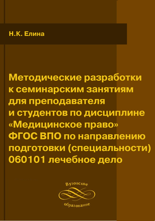 Елина, Н. К. Методические разработки к семинарским занятиям для преподавателя и студентов по дисциплине Медицинское право. ФГОС ВПО по направлению подготовки (специальности) 060101 лечебное дело : учебно-методическое пособие / Н. К. Елина. — Самара : РЕАВИЗ, 2012. — 141 c. — Текст : электронный // Цифровой образовательный ресурс IPR SMART : [сайт]. — URL: https://www.iprbookshop.ru/18409.html (дата обращения: 06.08.2025). — Режим доступа: для авторизир. пользователей