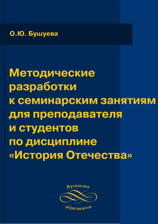 Бушуева, О. Ю. Методические разработки к семинарским занятиям для преподавателя и студентов по дисциплине «История Отечества» : учебно-методическое пособие / О. Ю. Бушуева. — Самара : РЕАВИЗ, 2012. — 144 c. — Текст : электронный // Цифровой образовательный ресурс IPR SMART : [сайт]. — URL: https://www.iprbookshop.ru/18410.html (дата обращения: 12.09.2025). — Режим доступа: для авторизир. пользователей