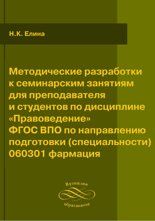 Елина, Н. К. Методические разработки к семинарским занятиям для преподавателя и студентов по дисциплине «Правоведение». ФГОС ВПО по направлению подготовки (специальности) 060301 фармация : учебно-методическое пособие / Н. К. Елина. — Самара : РЕАВИЗ, 2011. — 120 c. — Текст : электронный // Цифровой образовательный ресурс IPR SMART : [сайт]. — URL: https://www.iprbookshop.ru/18413.html (дата обращения: 12.11.2025). — Режим доступа: для авторизир. пользователей