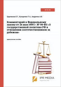 Царенкова, Е. Г. Комментарий к Федеральному закону от 24 мая 1999 г. № 99-ФЗ «О государственной политике РФ в отношении соотечественников за рубежом» / Е. Г. Царенкова, Т. А. Кухаренко, А. В. Андреева. — Саратов : Ай Пи Эр Медиа, 2011. — 122 c. — Текст : электронный // Цифровой образовательный ресурс IPR SMART : [сайт]. — URL: https://www.iprbookshop.ru/1964.html (дата обращения: 20.10.2024). — Режим доступа: для авторизир. пользователей