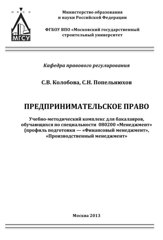 Колобова С.В. Предпринимательское право : учебно-методический комплекс для бакалавров / Колобова С.В., Попельнюхов С.Н.. — Москва : Московский государственный строительный университет, ЭБС АСВ, 2013. — 224 c. — Текст : электронный // Цифровой образовательный ресурс IPR SMART : [сайт]. — URL: https://www.iprbookshop.ru/20025.html (дата обращения: 05.12.2025). — Режим доступа: для авторизир. пользователей
