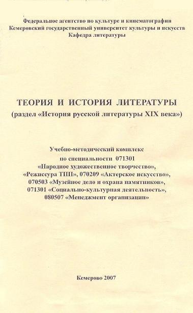 Теория и история литературы (раздел «История русской литературы XIX века»). Учебно-методический комплекс по специальности 071301 «Народное художественное творчество», «Режиссура ТПП», 070209 «Актерское искусство», 070503 «Музейное дело и охрана памятников», 071301 «Социально-культурная деятельность», 080507 «Менеджмент организаци