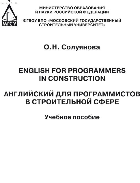 Солуянова, О. Н. Английский для программистов в строительной сфере. English for programmers in construction : учебное пособие / О. Н. Солуянова. — Москва : Московский государственный строительный университет, ЭБС АСВ, 2013. — 160 c. — ISBN 978-5-7264-0759-3. — Текст : электронный // Цифровой образовательный ресурс IPR SMART : [сайт]. — URL: https://www.iprbookshop.ru/23717.html (дата обращения: 17.04.2025). — Режим доступа: для авторизир. пользователей