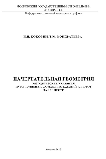 Коковин, Н. И. Начертательная геометрия : методические указания по выполнению домашних заданий (эпюров) за I семестр / Н. И. Коковин, Т. М. Кондратьева. — Москва : Московский государственный строительный университет, ЭБС АСВ, 2013. — 66 c. — Текст : электронный // Цифровой образовательный ресурс IPR SMART : [сайт]. — URL: https://www.iprbookshop.ru/23733.html (дата обращения: 19.03.2025). — Режим доступа: для авторизир. пользователей