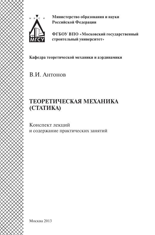 Антонов В.И. Теоретическая механика (статика) : конспект лекций и содержание практических занятий / Антонов В.И.. — Москва : Московский государственный строительный университет, ЭБС АСВ, 2013. — 84 c. — Текст : электронный // Цифровой образовательный ресурс IPR SMART : [сайт]. — URL: https://www.iprbookshop.ru/23750.html (дата обращения: 15.12.2025). — Режим доступа: для авторизир. пользователей