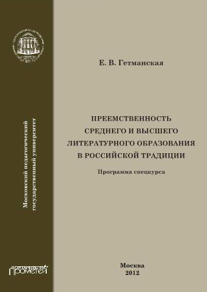 Гетманская, Е. В. Преемственность среднего и высшего литературного образования в российской традиции : спецкурс / Е. В. Гетманская. — Москва : Прометей, 2012. — 68 c. — ISBN 978-5-7042-2315-3. — Текст : электронный // Цифровой образовательный ресурс IPR SMART : [сайт]. — URL: https://www.iprbookshop.ru/24014.html (дата обращения: 09.05.2025). — Режим доступа: для авторизир. пользователей