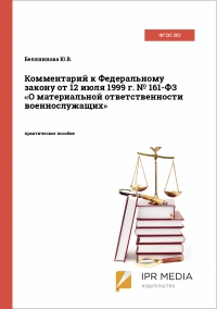 Белянинова, Ю. В. Комментарий к Федеральному закону от 12 июля 1999 г. № 161-ФЗ «О материальной ответственности военнослужащих» / Ю. В. Белянинова. — Саратов : Ай Пи Эр Медиа, 2011. — 70 c. — Текст : электронный // Цифровой образовательный ресурс IPR SMART : [сайт]. — URL: https://www.iprbookshop.ru/2619.html (дата обращения: 29.10.2024). — Режим доступа: для авторизир. пользователей