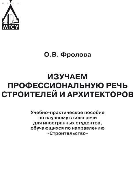 Фролова, О. В. Изучаем профессиональную речь строителей и архитекторов : учебно-практическое пособие по научному стилю речи для иностранных студентов, обучающихся по направлению «Строительство» / О. В. Фролова. — Москва : Московский государственный строительный университет, ЭБС АСВ, 2014. — 136 c. — ISBN 978-5-7264-0836-1. — Текст : электронный // Цифровой образовательный ресурс IPR SMART : [сайт]. — URL: https://www.iprbookshop.ru/26856.html (дата обращения: 01.11.2024). — Режим доступа: для авторизир. пользователей