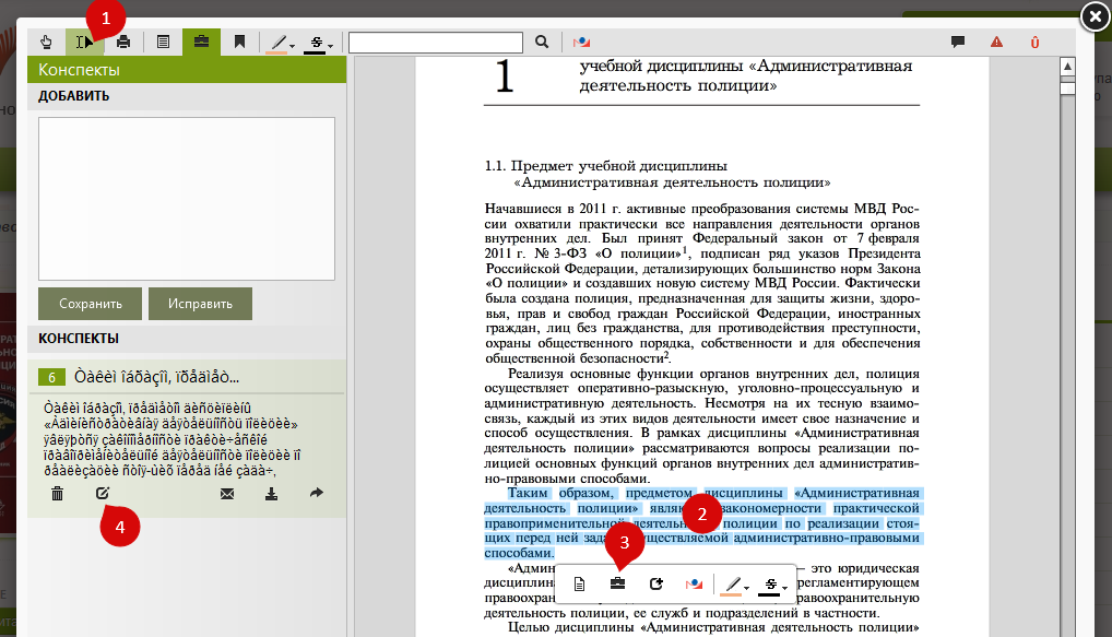 выделите текст, который Вы хотите законспектировать(1-2), создайте конспект нажатием кнопки "Создать новый конспект"(3), откройте созданный конспект для редактирования кнопкой "Редактировать"(4):
