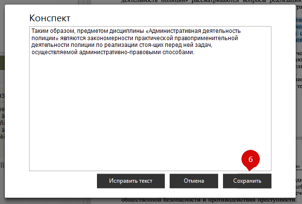 Затем нажмите "Исправить текст"(5) и сохраните исправленный конспект(6):