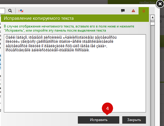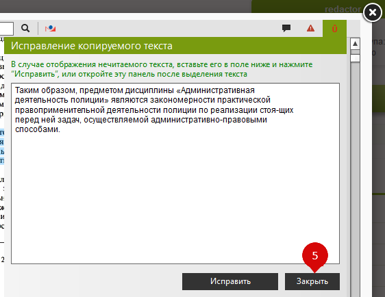 В открывшемся окне нажмите кнопку "Исправить"(4), скопируйте исправленный текст в текстовый редактор, и закройте окно(5):