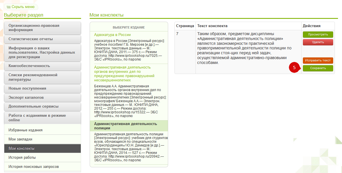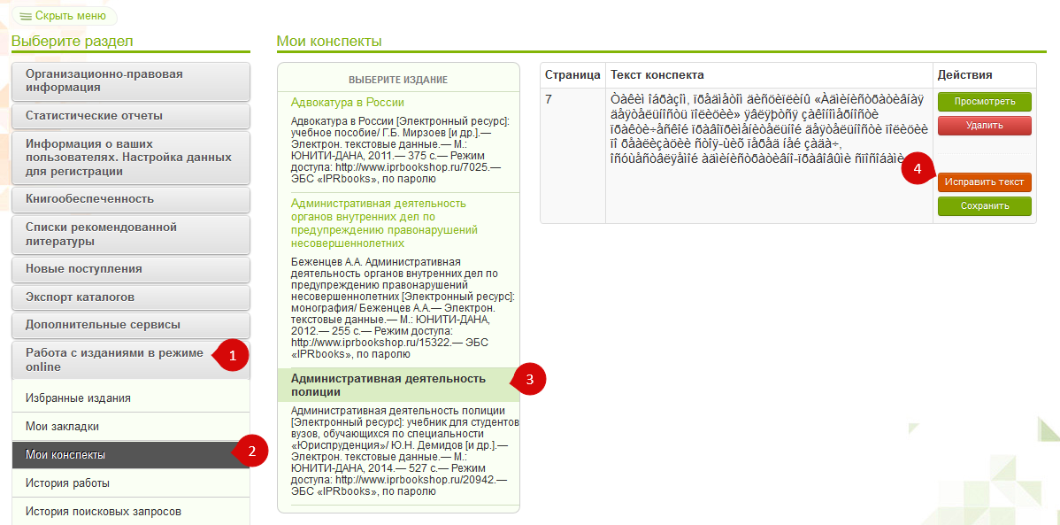 в личном кабинете откройте раздел "Работа с изданиями в режиме online"(1) и выберите пункт "Мои конспекты"(2). Затем выберите книгу, по тексту которой был создан конспект(3) и нажмите кнопку "Исправить текст"(4):