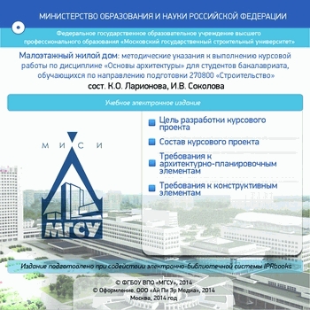 Малоэтажный жилой дом : методические указания к выполнению курсовой работы по дисциплине «Основы архитектуры» для студентов бакалавриата, обучающихся по направлению подготовки 270800 «Строительство» / . — Москва : Московский государственный строительный университет, Ай Пи Эр Медиа, ЭБС АСВ, 2014. — 43 c. — ISBN 978-5-7264-0950-4. — Текст : электронный // Цифровой образовательный ресурс IPR SMART : [сайт]. — URL: https://www.iprbookshop.ru/27464.html (дата обращения: 05.12.2025). — Режим доступа: для авторизир. пользователей