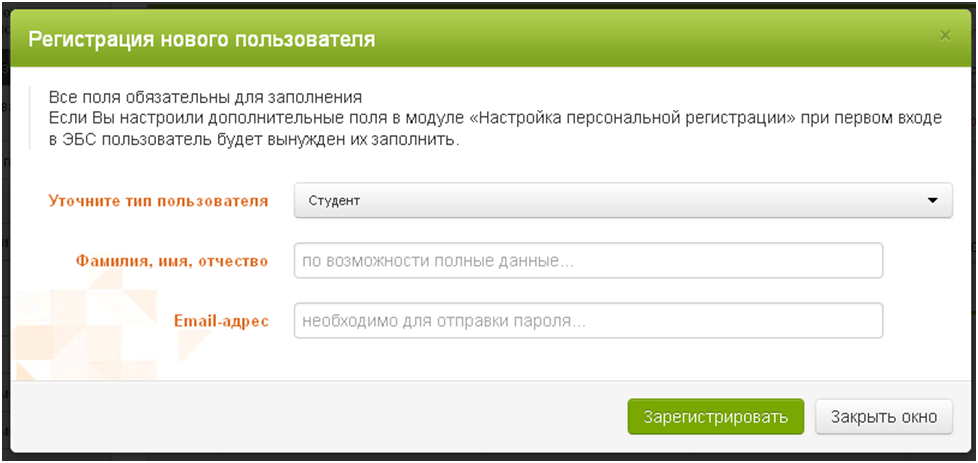позволяет сотрудникам библиотеки самостоятельно зарегистрировать нового пользователя, указав тип пользователя, ФИО, e-mail: