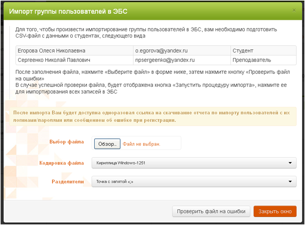 позволяет сотрудникам библиотеки зарегистрировать сразу нескольких пользователей списком. В открывшемся окне (рисунок ниже) приведен вид списка. Файл со списком должен иметь формат .csv, создать такой файл можно при помощи программы Microsoft Excel (подробную инструкцию по данному виду регистрации читайте в разделе FAQ/Сотруднику библиотеки/Регистрация пользователей списком):
