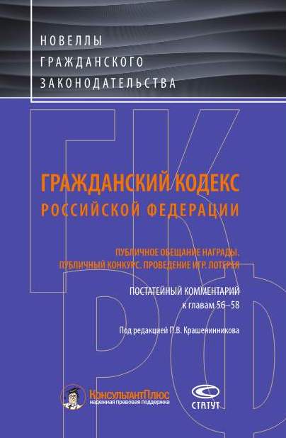 Гражданский кодекс Российской Федерации. Публичное обещание награды. Публичный конкурс. Проведение игр. Лотерея : постатейный комментарий к главам 56–58 / А. А. Клишин, П. В. Крашенинников, О. А. Рузакова, А. А. Шугаев ; под редакцией П. В. Крашенинников. — Москва : Статут, 2014. — 80 c. — ISBN 978-5-8354-1028-6. — Текст : электронный // Цифровой образовательный ресурс IPR SMART : [сайт]. — URL: https://www.iprbookshop.ru/29146.html (дата обращения: 15.09.2024). — Режим доступа: для авторизир. пользователей