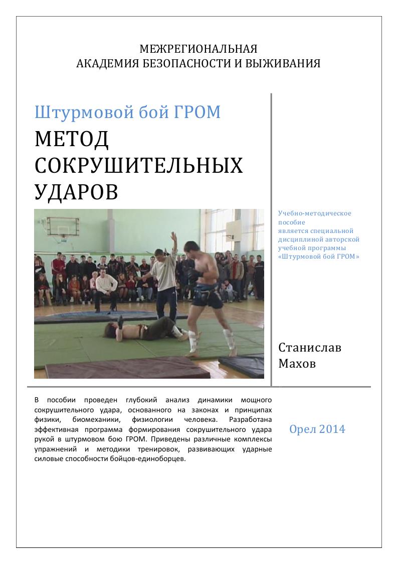 В пособии проведен глубокий анализ динамики мощного сокрушительного удара, основанного на законах и принципах физики, биомеханики, физиологии человека. Разработана эффективная программа формирования сокрушительного удара рукой в штурмовом бою ГРОМ. Приведены различные комплексы упражнений и методики тренировок, развивающих ударные силовые способности бойцов-единоборцев. Предназначено в качестве профессионально-прикладной физической подготовки студентов вузов всех специальностей, в соответствии с требованиями Государственного образовательного стандарта высшего профессионального образования по дисциплине «Физическая культура», а также для широкого круга лиц, занимающихся самообороной и боевыми единоборствами в формировании мощных сокрушительных ударов руками.
