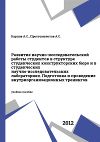 Карпов, А. С. Развитие научно-исследовательской работы студентов в структуре студенческих конструкторских бюро и в студенческих научно-исследовательских лабораториях. Подготовка и проведение внутриорганизационных тренингов : учебное пособие / А. С. Карпов, А. С. Простомолотов. — Москва : Российский государственный университет инновационных технологий и предпринимательства, 2012. — 142 c. — ISBN 978-5-98427-051-9. — Текст : электронный // Цифровой образовательный ресурс IPR SMART : [сайт]. — URL: https://www.iprbookshop.ru/33842.html (дата обращения: 19.09.2025). — Режим доступа: для авторизир. пользователей