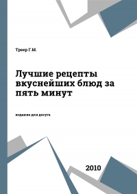 Треер, Г. М. Лучшие рецепты вкуснейших блюд за пять минут / Г. М. Треер. — Москва : РИПОЛ классик, 2010. — 256 c. — ISBN 978-5-386-02126-9. — Текст : электронный // Цифровой образовательный ресурс IPR SMART : [сайт]. — URL: https://www.iprbookshop.ru/37631.html (дата обращения: 10.08.2025). — Режим доступа: для авторизир. пользователей