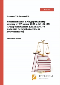 Кухаренко, Т. А. Комментарий к Федеральному закону от 27 июля 2006 г. № 152-ФЗ «О персональных данных» (3-е издание переработанное и дополненное) / Т. А. Кухаренко, Н. А. Захарова. — Саратов : Ай Пи Эр Медиа, 2016. — 151 c. — Текст : электронный // Цифровой образовательный ресурс IPR SMART : [сайт]. — URL: https://www.iprbookshop.ru/49154.html (дата обращения: 14.01.2025). — Режим доступа: для авторизир. пользователей