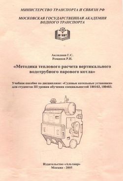Акладная Г.С. Методика теплового расчета вертикального водотрубного парового котла : учебное пособие по дисциплине: «Судовые котельные установки» / Акладная Г.С., Романов Р.Н.. — Москва : Московская государственная академия водного транспорта, 2005. — 61 c. — Текст : электронный // Цифровой образовательный ресурс IPR SMART : [сайт]. — URL: https://www.iprbookshop.ru/49221.html (дата обращения: 08.12.2025). — Режим доступа: для авторизир. пользователей