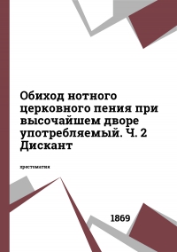 Обиход нотного церковного пения при высочайшем дворе употребляемый. Ч. 2 Дискант / . — Санкт-Петербург : Российская национальная библиотека, 1869. — 384 c. — Текст : электронный // Цифровой образовательный ресурс IPR SMART : [сайт]. — URL: https://www.iprbookshop.ru/53065.html (дата обращения: 19.12.2025). — Режим доступа: для авторизир. пользователей