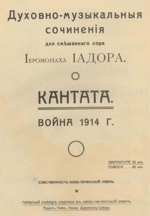 Иадор Кантата. «Война 1914 г.». «Отче наш!...». Для смешанного хора без сопровождения / Иадор. — Санкт-Петербург : Российская национальная библиотека, 1915. — 15 c. — Текст : электронный // Цифровой образовательный ресурс IPR SMART : [сайт]. — URL: https://www.iprbookshop.ru/53220.html (дата обращения: 06.12.2025). — Режим доступа: для авторизир. пользователей