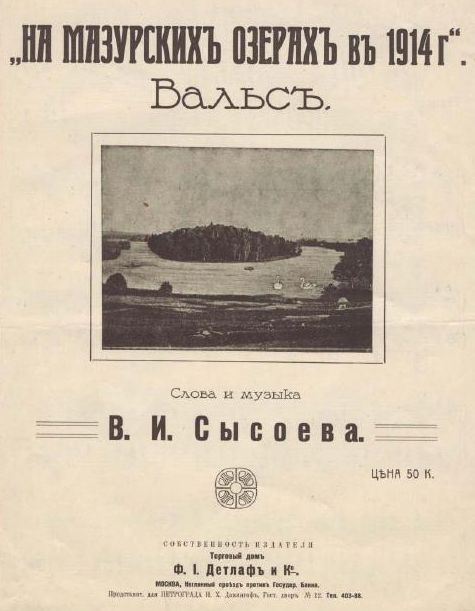 Сысоев В.И. На Мазурских озерах в 1914 г. «Мазурские озера луной освещены…». Вальс. Для фортепиано с надписанным текстом / Сысоев В.И.. — Санкт-Петербург : Российская национальная библиотека, 1914. — 3 c. — Текст : электронный // Цифровой образовательный ресурс IPR SMART : [сайт]. — URL: https://www.iprbookshop.ru/53228.html (дата обращения: 05.12.2025). — Режим доступа: для авторизир. пользователей