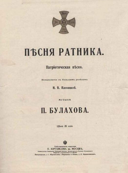 Булахов П.П. Песня ратника. «Что ты матушка рыдаешь…». Патриотическая песня. Для голоса с фортепиано / Булахов П.П.. — Санкт-Петербург : Российская национальная библиотека, 1914. — 4 c. — Текст : электронный // Цифровой образовательный ресурс IPR SMART : [сайт]. — URL: https://www.iprbookshop.ru/53236.html (дата обращения: 07.12.2025). — Режим доступа: для авторизир. пользователей