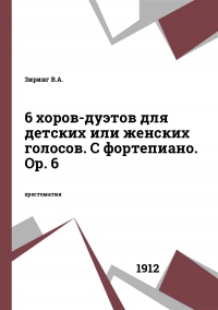 Зиринг В.А. 6 хоров-дуэтов для детских или женских голосов. С фортепиано. Ор. 6 / Зиринг В.А.. — Санкт-Петербург : Российская национальная библиотека, 1912. — 21 c. — Текст : электронный // Цифровой образовательный ресурс IPR SMART : [сайт]. — URL: https://www.iprbookshop.ru/53269.html (дата обращения: 05.12.2025). — Режим доступа: для авторизир. пользователей