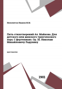 Ипполитов-Иванов М.М. Пять стихотворений Ал. Майкова. Для детского или женского трехголосного хора. С фортепиано. Ор. 32. Николаю Михайловичу Ладухину / Ипполитов-Иванов М.М.. — Санкт-Петербург : Российская национальная библиотека, 1901. — 30 c. — Текст : электронный // Цифровой образовательный ресурс IPR SMART : [сайт]. — URL: https://www.iprbookshop.ru/53270.html (дата обращения: 06.12.2025). — Режим доступа: для авторизир. пользователей