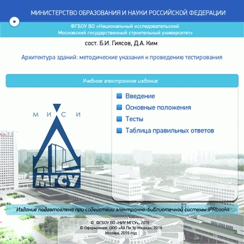Архитектура зданий : методические указания к проведению тестирования / . — Москва : Московский государственный строительный университет, Ай Пи Эр Медиа, ЭБС АСВ, 2016. — 48 c. — ISBN 978-5-7264-1343-3. — Текст : электронный // Цифровой образовательный ресурс IPR SMART : [сайт]. — URL: https://www.iprbookshop.ru/54679.html (дата обращения: 05.12.2025). — Режим доступа: для авторизир. пользователей
